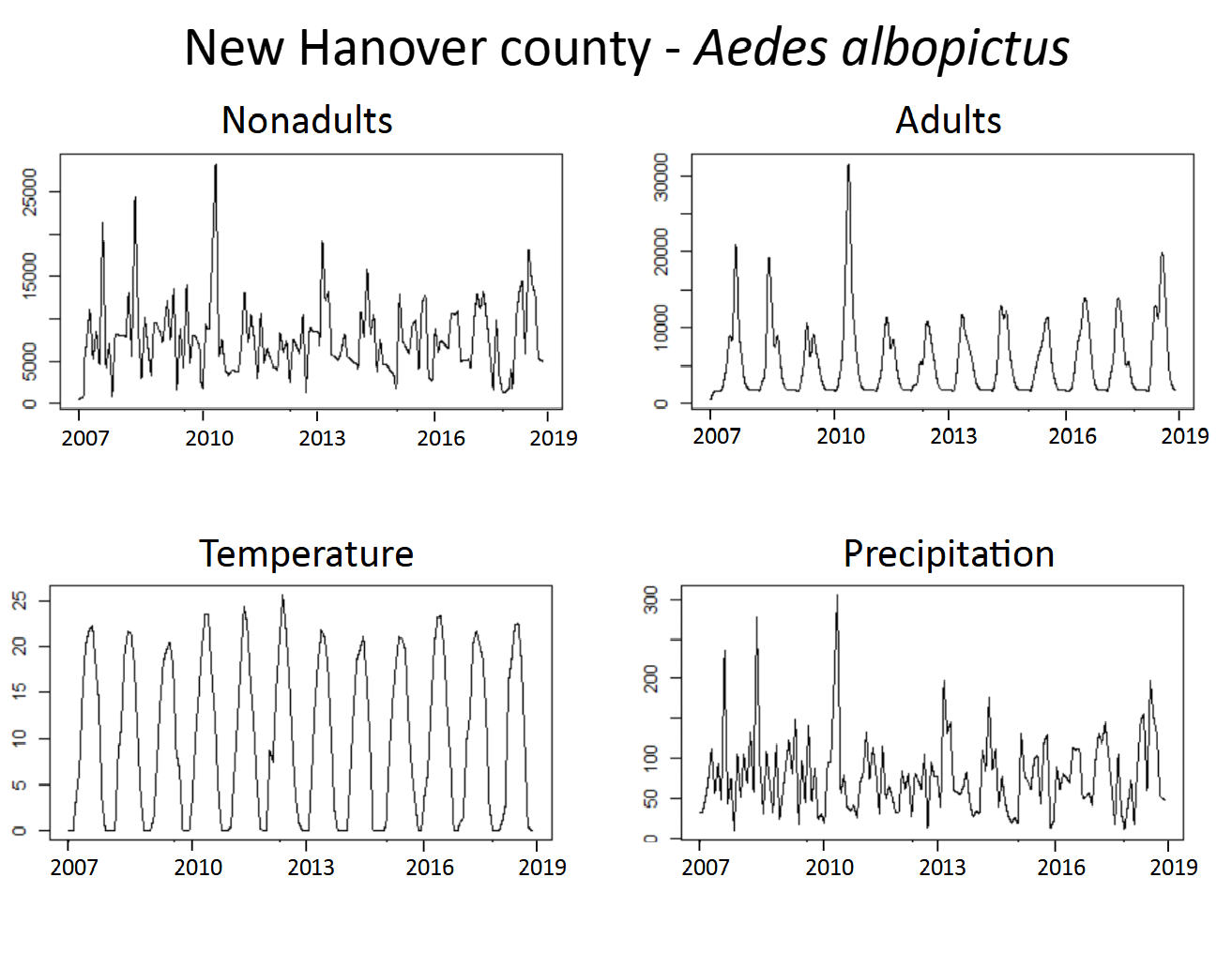 I carried out a social-ecological study of Aedes aegypti risk in southern coastal Ecuador which required extensive data cleaning and analysis. I used hierarchical models within a multi-model, information criterion approach to investigate risk factors. Other projects I worked also concerned Ecuador and arboviral disease. These include identifying spatial-temporal clusters of Dengue fever using point pattern analyses and using health access models to simulate alternative vector control regiments.